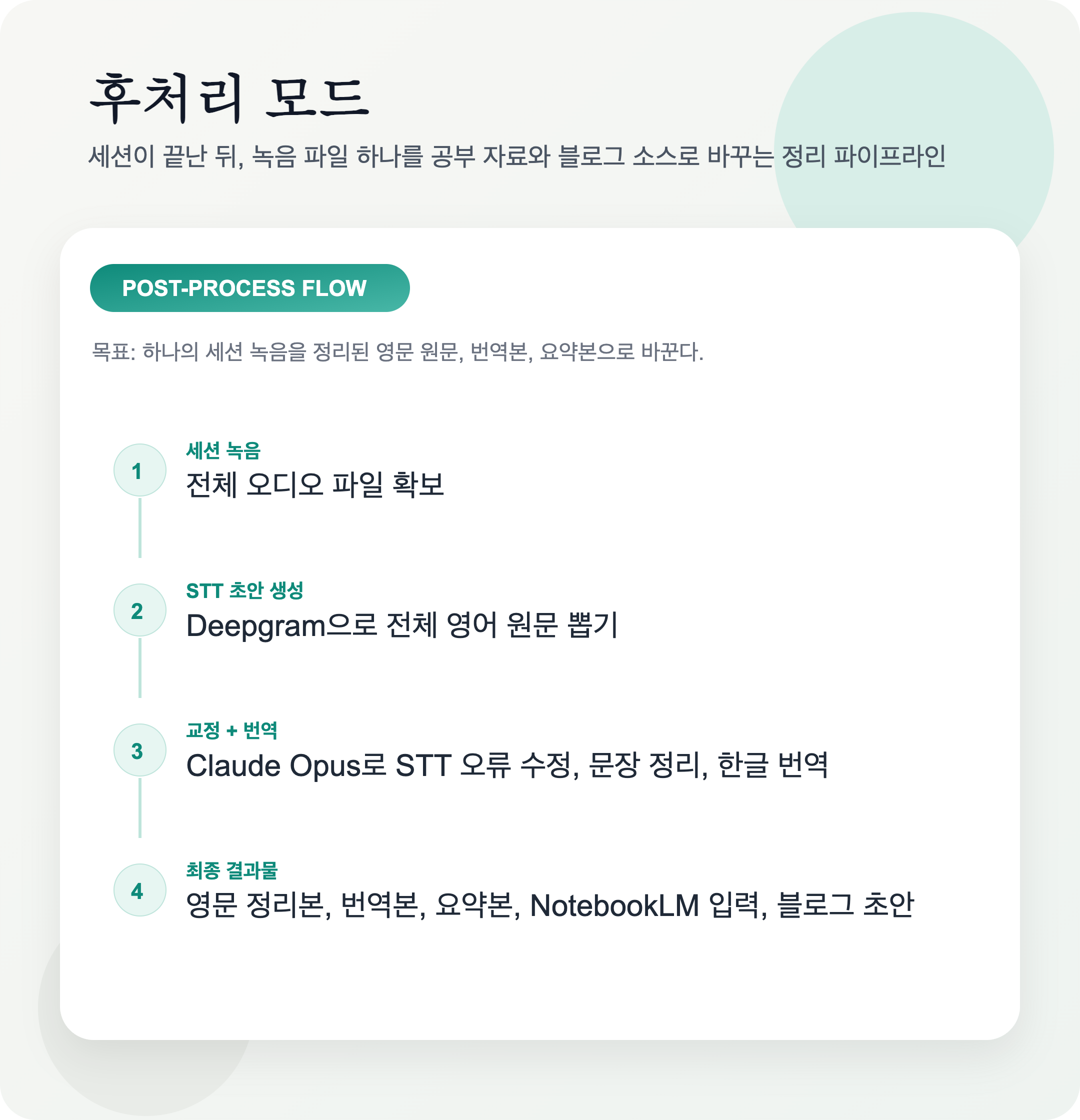 녹음 파일이 있으면 후처리 파이프라인을 돌린다. 흐름은 이렇다.