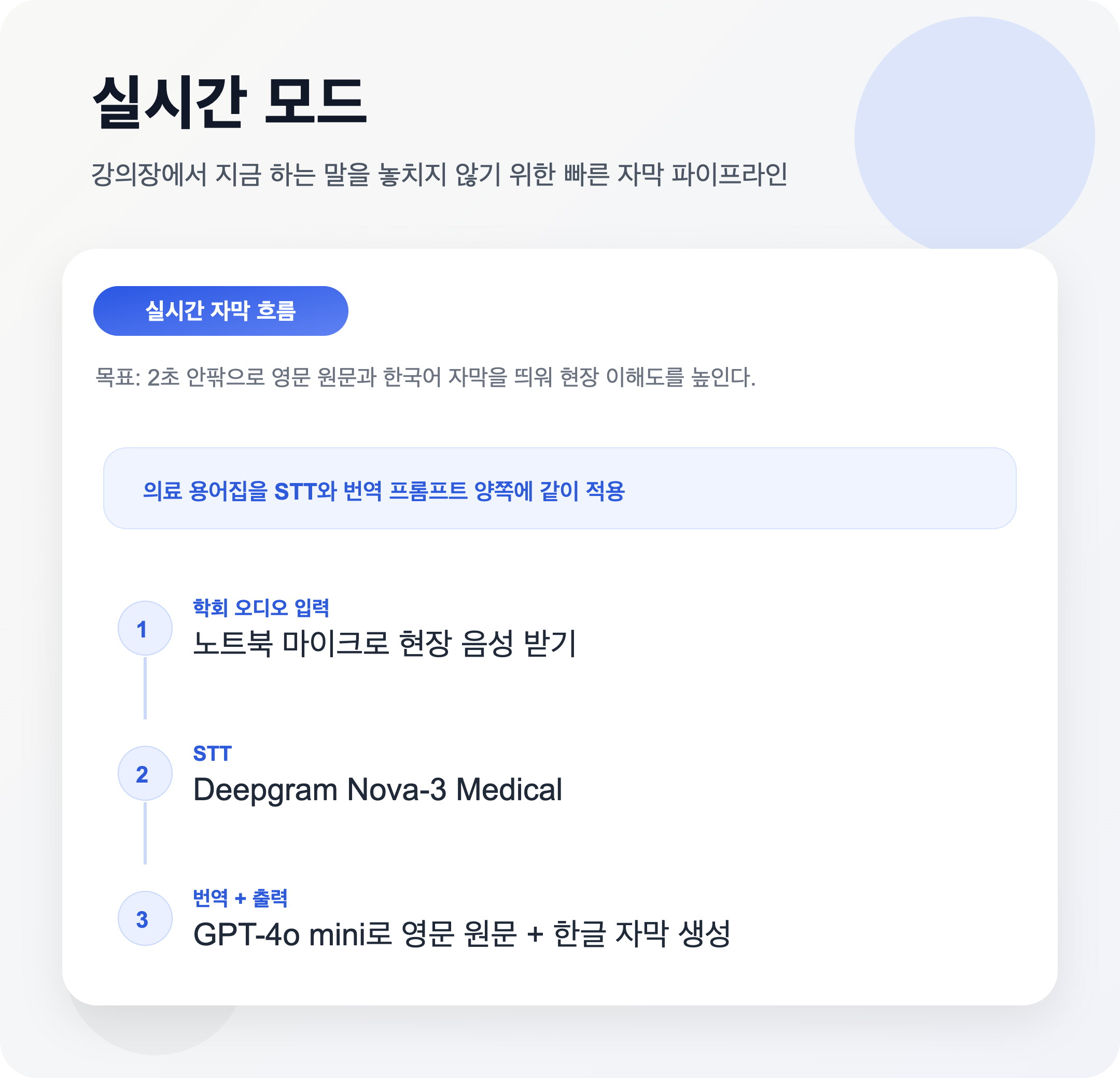 - 구성: Deepgram Medical STT + GPT-4o mini 번역 + 의료 용어집