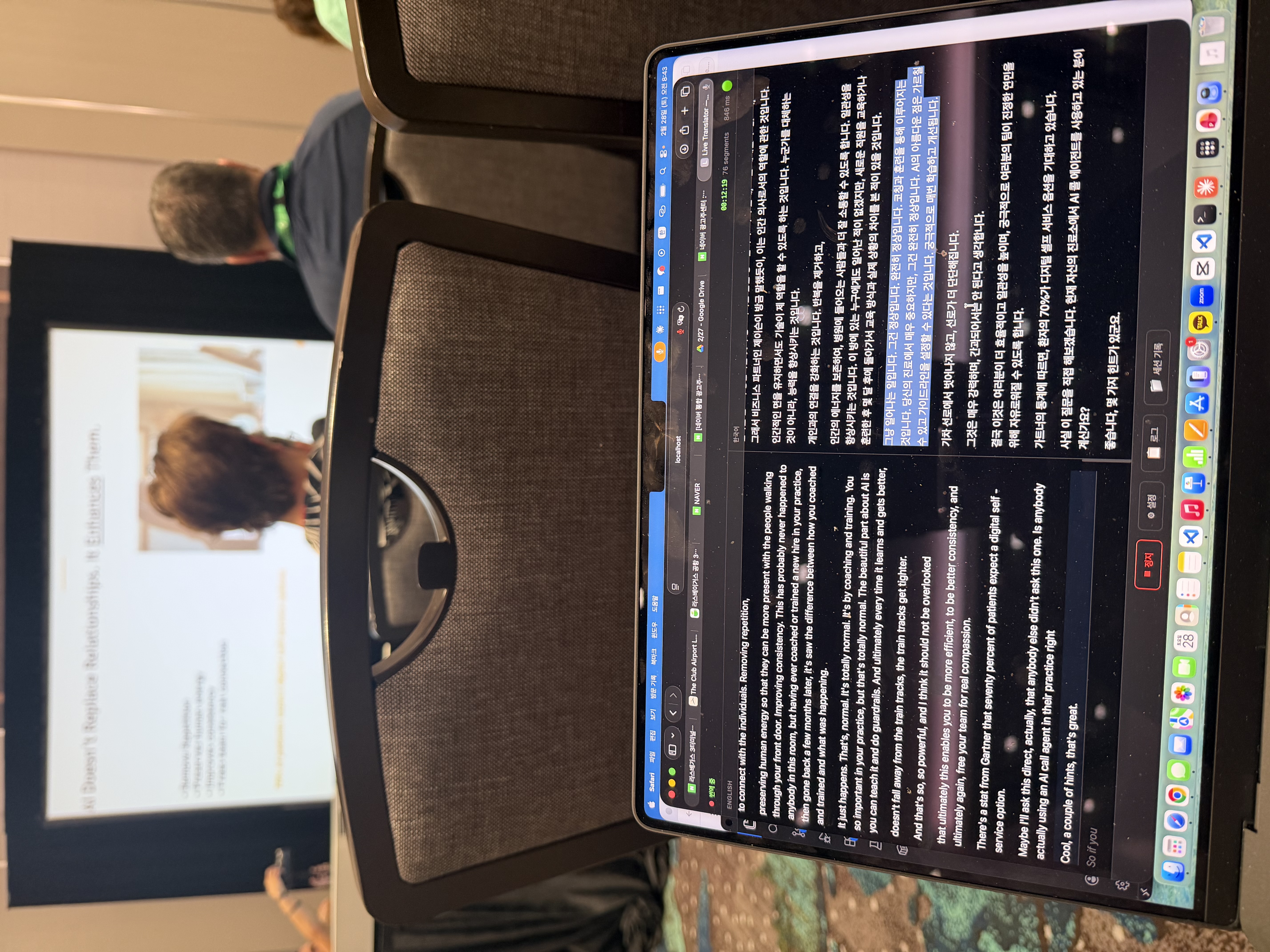 핸드폰-컴퓨터 연결을 시도하니 딜레이가 생겼다. 내 현장 기준으로 실시간 자막이 3-4초씩 밀리면 의미가 없다. 결국 핸드폰 연결을 포기하고 그냥 노트북 마이크로 직접 했는데, 학회 오디오 시스템이 워낙 빵빵해서 그게 충분했다. 집 티비 테스트에서 문제였던 포집이 여기선 문제가 아니었다.